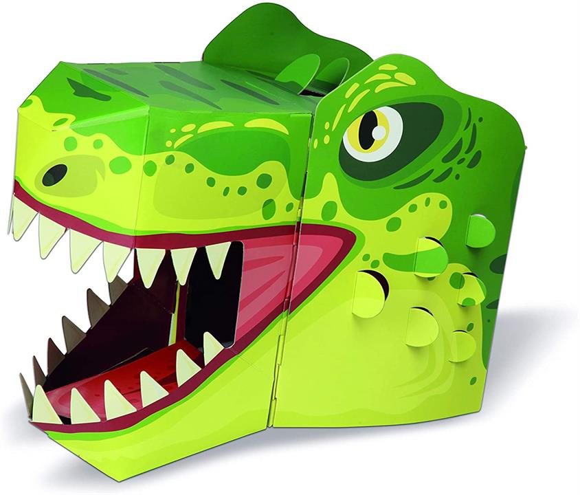 The colourful cardboard pieces slot together to create a T-Rex helmet!