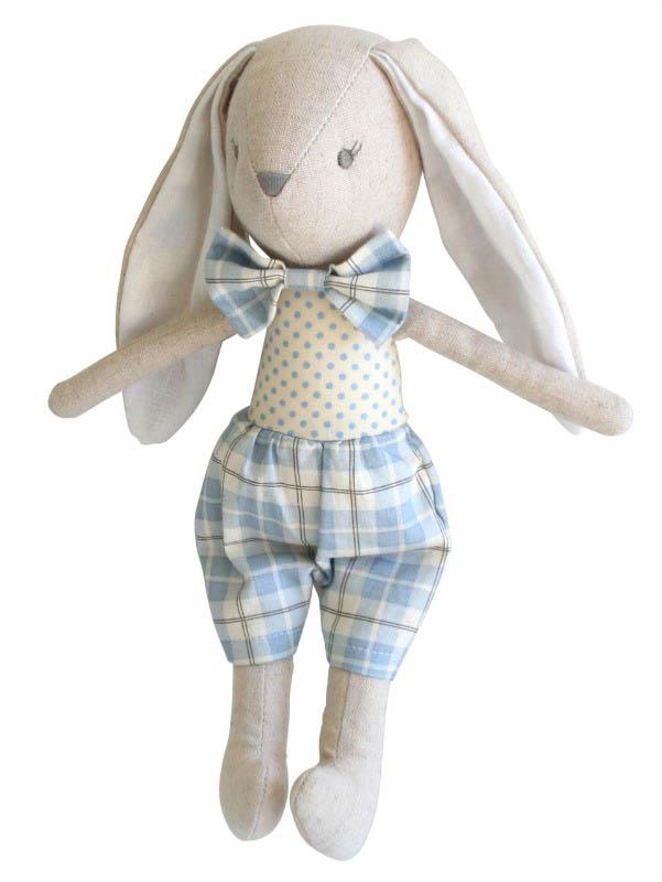 Gorgeous Louie Bunny will love to be every little boy’s and girl’s snugly, new best friend. Made from fine linen fabric with daper blue gingham shorts and bow-tie detail.