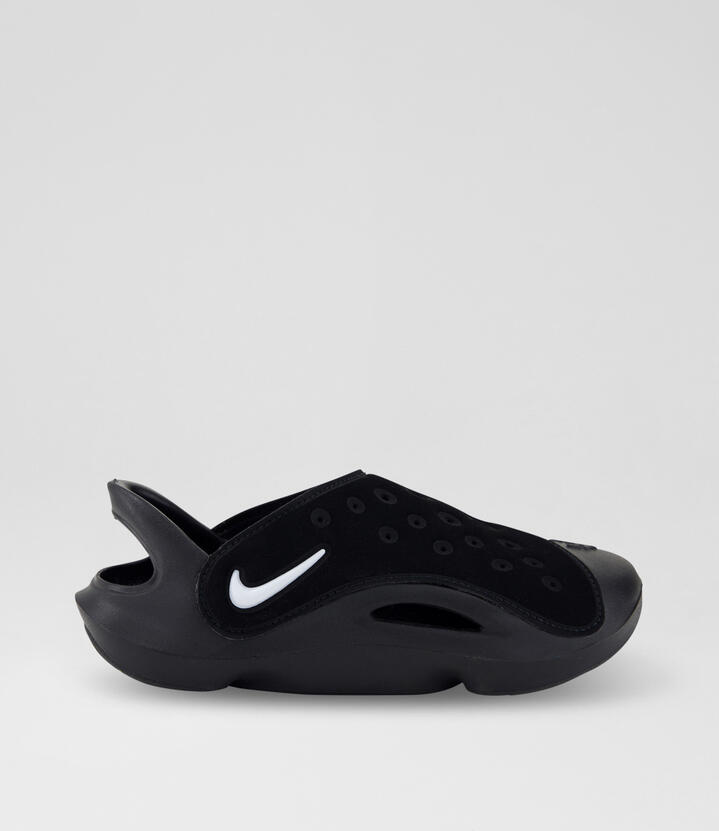 Help your little explorer stay ready for adventure with the Nike Aqua Swoosh. Soft fabric up top and plush foam underfoot help make for comfortable steps while a heel strap secures the fit. Plus, drainage holes on the upper and cutouts along the sides help make these ideal for splash pads, pool days and other water activities.