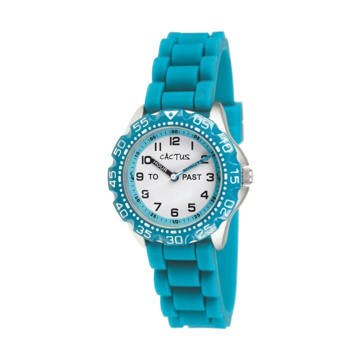 A true time teacher, this cute little watch has a rotating bezel with markings from 0-60,and the hour, minute and second hands are in 3 different colours to assist with telling the time. Fitted with a comfortable silicon watch band, this attractive watch is for everyday use [but not for the shower or pool as it is 3 ATM].