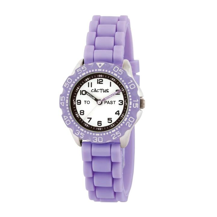 A true time teacher, this cute little watch has a rotating bezel with markings from 0-60,and the hour, minute and second hands are in 3 different colours to assist with telling the time. Fitted with a comfortable silicon watch band, this attractive watch is for everyday use [but not for the shower or pool as it is 3 ATM].