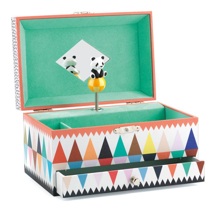 Children will love to listen and watch the panda spin whilst having a perfect box for storing all sorts of trinkets. Featuring a spot for rings and a pull out drawer for storing extra special treasures.