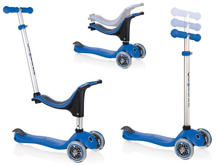 One product with 4 positions and 4 functions! Security is key with height adjustable handle bars, steering lock and a low footboard. The Globber Evo 4 in 1 will transition and grow with your child. Just add the stick/handle from 12months old for Mum and Dad to guide or push the little one around. Fit it with a seat for children from 15 months to transform it into a scooter/balance bike.