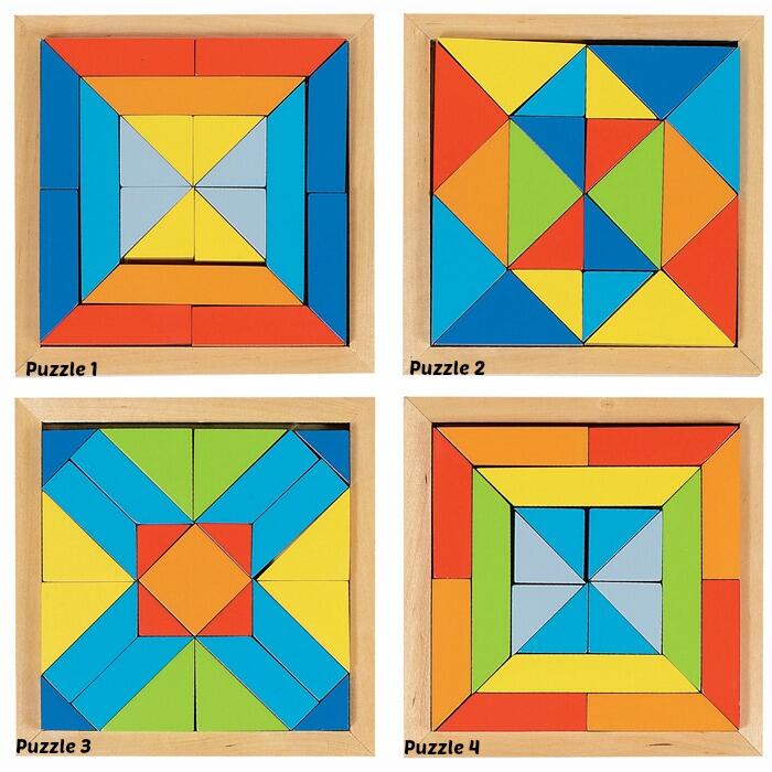 Each wooden puzzle is encased in a wooden tray for neat packing up and contains between 20 and 25 blocks, all brightly coloured to mix and match.