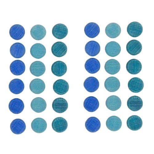 36 small wooden coins in various shades of blue