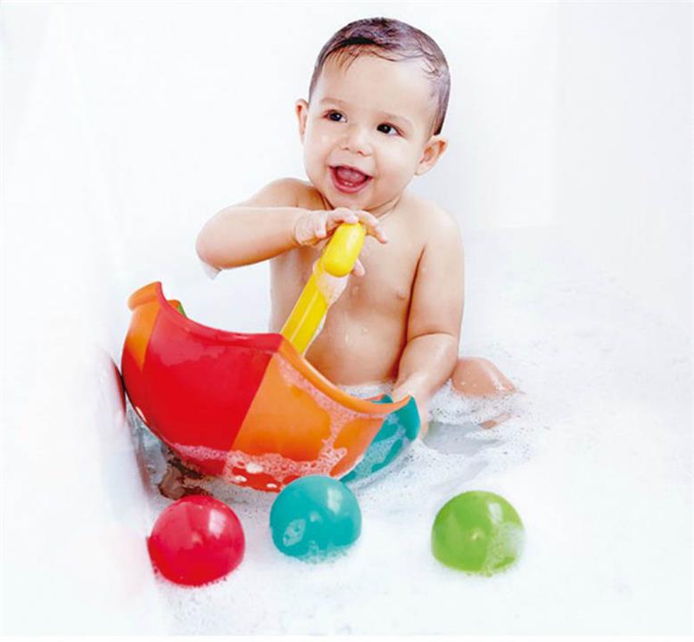 An entertaining and delightfully colourful bath set, featuring an umbrella which drains water through the raindrop holes and can catch and scoop the plastic balls.