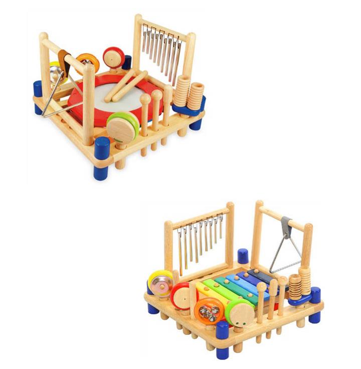 The Melody Mix is a delightful musical activity toy that comes with 10 removable music instruments : xylophone, drum, tubular chimes, triangle, cymbal, bells, maracas, castanet, double guiro, and pair of rhythm sticks plus 2 strikers and 1 scraper.