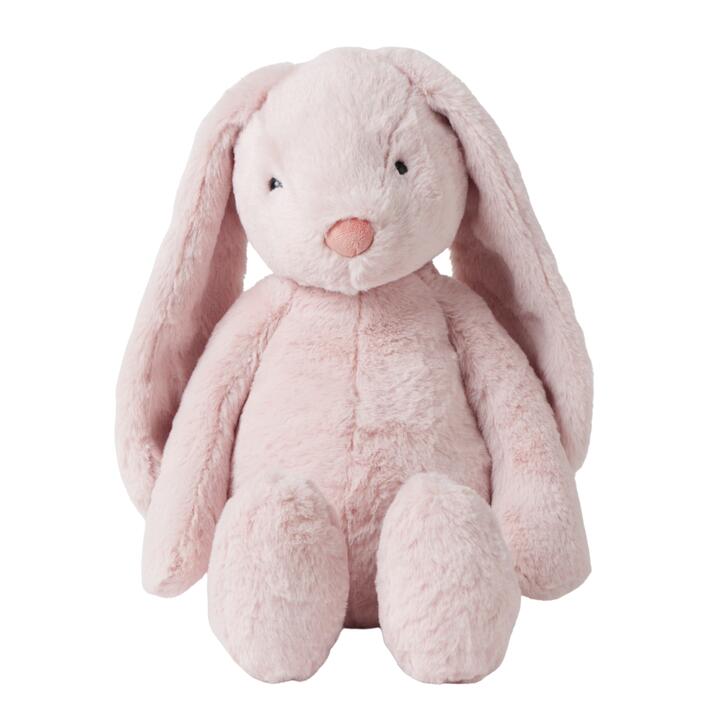 With its sweet pink hue, velvety soft fur, and floppy ears just right for little hands to hold, this bunny is as huggable as it is adorable. Its larger size means even bigger cuddles, while the beanie filled bottom helps it sit upright for play or display.
