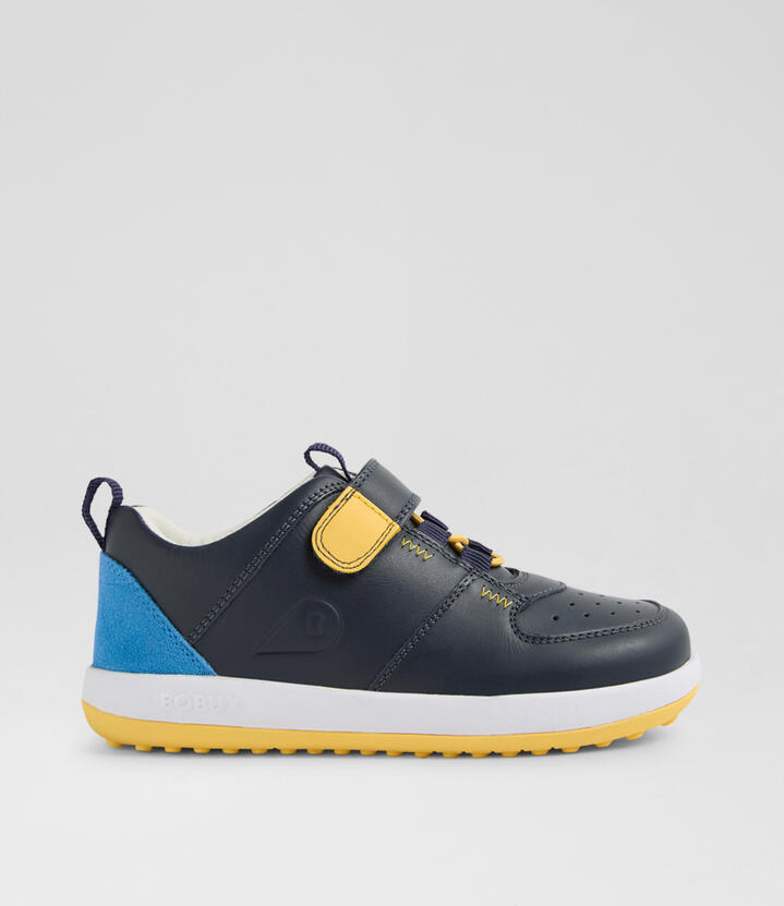 Amp up their style with the new BACKSPIN sneakers. Made from soft leather, this sporty style is as comfortable as it is stylish. Created in our new Bobux fit which pairs a lightweight EVA midsole with extra flex points on the bottom for increased natural movement, BACKSPIN also features a single hook-and-loop strap with laces for secure fastening. Made for confident, active kids.