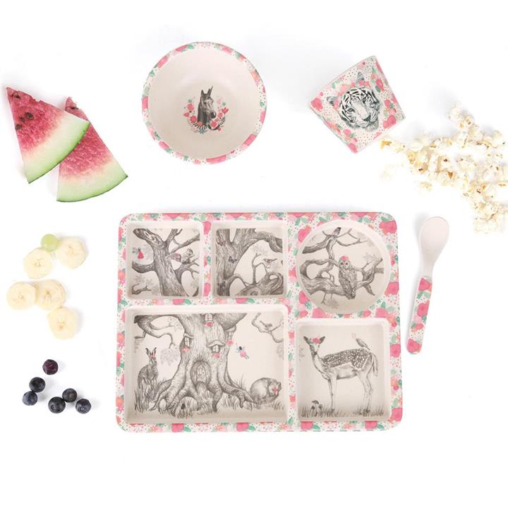 Welcome to the enchanted forest!Once upon a time we discovered an enchanted tree, where majestic and magical creatures gathered. Your little one will love befriending unicorns, deers, owls, squirrels, foxes, fairies and more during mealtime with this gorgeous dinner set. Thoughtfully designed, this 5-piece set features wide-based cups perfect for miniature hands to hold, and smooth cornered plate compartments making washing a cinch.It also features a suction cup for placing under the plate or bowl to help little eaters keep their meal exactly where they want it – in front of them!This set includes: 5 Section Divided Plate – 21 x 27cm Small Bowl – 13.5 x 11.5 x 5cm Cup – 6 x 6.5cm Spoon – 13.5cm long Suction Cap