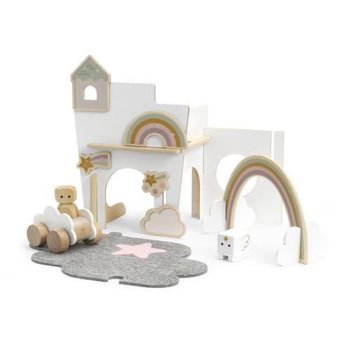 The Micki Play World Rainbow includes: 5 walls, 1 figurine, 1 animal, 1 rainbow, 1 cloud car, 5 magnets (rainbow, shooting star, magic wand, tower, and clouds), and a 2-part cloud-shaped felt play mat.