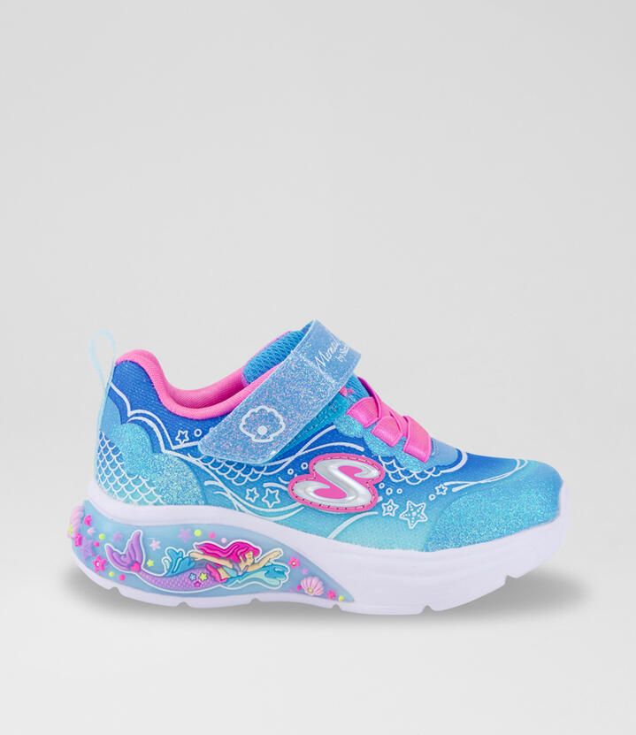 Playful lights and colorful fun combine in Skechers My Dreamers – Lil Mermaid. This light-up sky-themed style features an ombre glitter mesh and synthetic upper with stretch laces, adjustable instep strap and a well-cushioned light-up midsole.