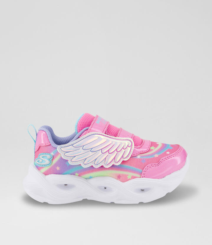 Light up their steps with sporty style and comfort in Skechers S-Lights. Featuring a rainbow print mesh and synthetic upper, cushioned insole, Skechers adaptive closure, unicorn wing strap closure, and a lighted midsole.