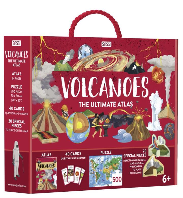 An atlas full of information and curiosities and a large box containing various fun and interactive activities dedicated to volcanoes to learn while having fun.