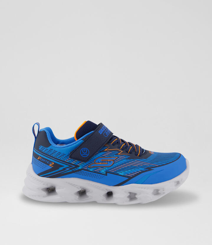 This lighted Skechers adaptive closure design features a lightweight synthetic and mesh upper with a 3D haptic print, stretch laces, an adjustable instep strap, and a cushioned comfort insole.